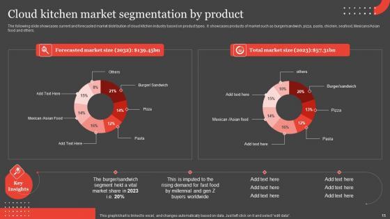 The following slide showcases current and forecasted market distribution of cloud kitchen industry based on product types. It showcases products of market such as burger or sandwich, pizza, pasta, chicken, seafood, Mexicans or Asian food and others. Create an editable Cloud Kitchen Market Segmentation By Product International Food Delivery Professional Pdf that communicates your idea and engages your audience. Whether you are presenting a business or an educational presentation, pre-designed presentation templates help save time. Cloud Kitchen Market Segmentation By Product International Food Delivery Professional Pdf is highly customizable and very easy to edit, covering many different styles from creative to business presentations. Slidegeeks has creative team members who have crafted amazing templates. So, go and get them without any delay. The following slide showcases current and forecasted market distribution of cloud kitchen industry based on product types. It showcases products of market such as burger or sandwich, pizza, pasta, chicken, seafood, Mexicans or Asian food and others.