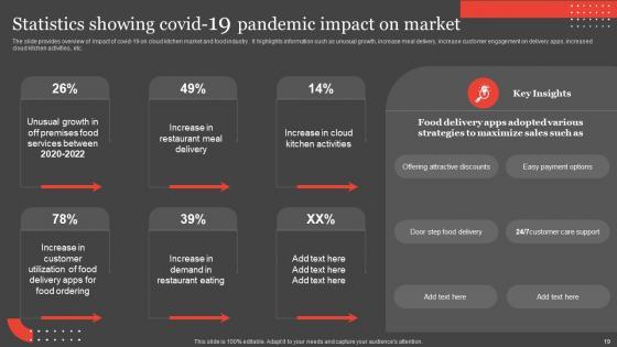 The slide provides overview of impact of covid-19 on cloud kitchen market and food industry . It highlights information such as unusual growth, increase meal delivery, increase customer engagement on delivery apps, increased cloud kitchen activities, etc. Find a pre-designed and impeccable International Food Delivery Market Statistics Showing Covid 19 Pandemic Impact Summary Pdf. The templates can ace your presentation without additional effort. You can download these easy-to-edit presentation templates to make your presentation stand out from others. So, what are you waiting for Download the template from Slidegeeks today and give a unique touch to your presentation. The slide provides overview of impact of covid-19 on cloud kitchen market and food industry . It highlights information such as unusual growth, increase meal delivery, increase customer engagement on delivery apps, increased cloud kitchen activities, etc.