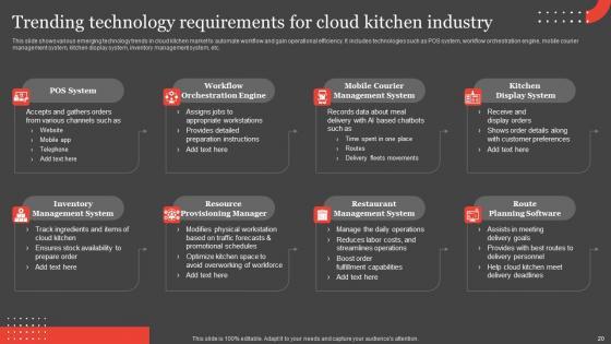 This slide shows various emerging technology trends in cloud kitchen market to automate workflow and gain operational efficiency. It includes technologies such as POS system, workflow orchestration engine, mobile courier management system, kitchen display system, inventory management system, etc. Create an editable International Food Delivery Market Trending Technology Requirements For Cloud Demonstration Pdf that communicates your idea and engages your audience. Whether you are presenting a business or an educational presentation, pre-designed presentation templates help save time. International Food Delivery Market Trending Technology Requirements For Cloud Demonstration Pdf is highly customizable and very easy to edit, covering many different styles from creative to business presentations. Slidegeeks has creative team members who have crafted amazing templates. So, go and get them without any delay. This slide shows various emerging technology trends in cloud kitchen market to automate workflow and gain operational efficiency. It includes technologies such as POS system, workflow orchestration engine, mobile courier management system, kitchen display system, inventory management system, etc.