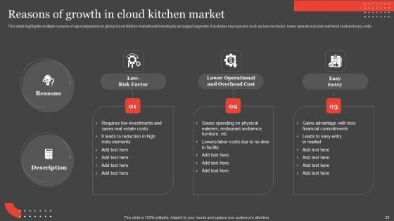 This slide highlights multiple reasons of rapid expansion in global cloud kitchen market and foresting to be largest segment. It includes key reasons such as low risk factor, lower operational and overhead cost and easy entry. Here you can discover an assortment of the finest PowerPoint and Google Slides templates. With these templates, you can create presentations for a variety of purposes while simultaneously providing your audience with an eye-catching visual experience. Download International Food Delivery Market Reasons Of Growth In Cloud Kitchen Market Themes Pdf to deliver an impeccable presentation. These templates will make your job of preparing presentations much quicker, yet still, maintain a high level of quality. Slidegeeks has experienced researchers who prepare these templates and write high-quality content for you. Later on, you can personalize the content by editing the International Food Delivery Market Reasons Of Growth In Cloud Kitchen Market Themes Pdf. This slide highlights multiple reasons of rapid expansion in global cloud kitchen market and foresting to be largest segment. It includes key reasons such as low risk factor, lower operational and overhead cost and easy entry.