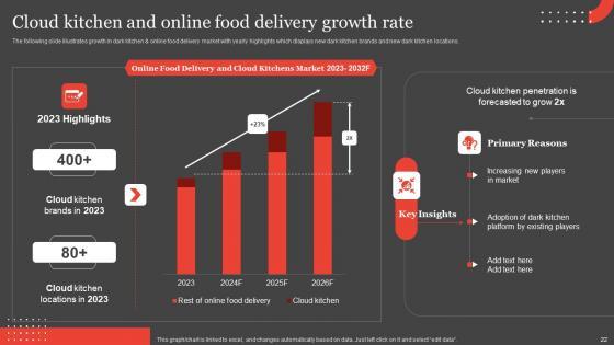 The following slide illustrates growth in dark kitchen and online food delivery market with yearly highlights which displays new dark kitchen brands and new dark kitchen locations. There are so many reasons you need a International Cloud Kitchen Industry Analysis Cloud Kitchen And Online Food Delivery Growth Rate Topics PDF. The first reason is you can not spend time making everything from scratch, Thus, Slidegeeks has made presentation templates for you too. You can easily download these templates from our website easily.