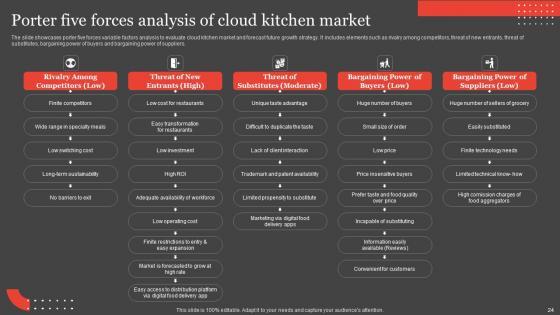 The slide showcases porter five forces variable factors analysis to evaluate cloud kitchen market and forecast future growth strategy. It includes elements such as rivalry among competitors, threat of new entrants, threat of substitutes, bargaining power of buyers and bargaining power of suppliers. Presenting this PowerPoint presentation, titled International Food Delivery Market Porter Five Forces Analysis Of Cloud Kitchen Market Designs Pdf, with topics curated by our researchers after extensive research. This editable presentation is available for immediate download and provides attractive features when used. Download now and captivate your audience. Presenting this International Food Delivery Market Porter Five Forces Analysis Of Cloud Kitchen Market Designs Pdf. Our researchers have carefully researched and created these slides with all aspects taken into consideration. This is a completely customizable International Food Delivery Market Porter Five Forces Analysis Of Cloud Kitchen Market Designs Pdf that is available for immediate downloading. Download now and make an impact on your audience. Highlight the attractive features available with our PPTs. The slide showcases porter five forces variable factors analysis to evaluate cloud kitchen market and forecast future growth strategy. It includes elements such as rivalry among competitors, threat of new entrants, threat of substitutes, bargaining power of buyers and bargaining power of suppliers.