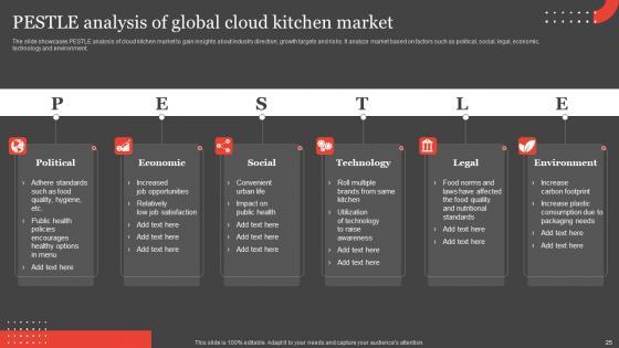 The slide showcases PESTLE analysis of cloud kitchen market to gain insights about industry direction, growth targets and risks. It analyze market based on factors such as political, social, legal, economic, technology and environment. Slidegeeks has constructed International Food Delivery Market Pestle Analysis Of Global Cloud Kitchen Market Portrait Pdf after conducting extensive research and examination. These presentation templates are constantly being generated and modified based on user preferences and critiques from editors. Here, you will find the most attractive templates for a range of purposes while taking into account ratings and remarks from users regarding the content. This is an excellent jumping-off point to explore our content and will give new users an insight into our top-notch PowerPoint Templates. The slide showcases PESTLE analysis of cloud kitchen market to gain insights about industry direction, growth targets and risks. It analyze market based on factors such as political, social, legal, economic, technology and environment.