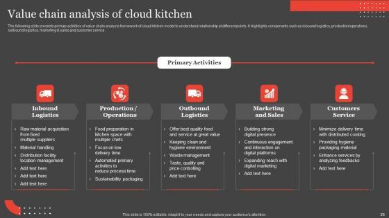 The following slide presents primary activities of value chain analysis framework of cloud kitchen model to understand relationship at different points. It highlights components such as inbound logistics, production or operations, outbound logistics, marketing and sales and customer service. Want to ace your presentation in front of a live audience Our International Food Delivery Market Value Chain Analysis Of Cloud Kitchen Guidelines Pdf can help you do that by engaging all the users towards you. Slidegeeks experts have put their efforts and expertise into creating these impeccable powerpoint presentations so that you can communicate your ideas clearly. Moreover, all the templates are customizable, and easy-to-edit and downloadable. Use these for both personal and commercial use. The following slide presents primary activities of value chain analysis framework of cloud kitchen model to understand relationship at different points. It highlights components such as inbound logistics, production or operations, outbound logistics, marketing and sales and customer service.