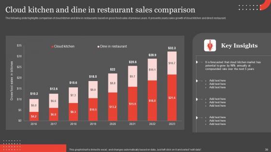 The following slide highlights comparison of cloud kitchen and dine in restaurants based on gross food sales of previous years. It presents yearly sales growth of cloud kitchen and direct restaurant. From laying roadmaps to briefing everything in detail, our templates are perfect for you. You can set the stage with your presentation slides. All you have to do is download these easy-to-edit and customizable templates. International Food Delivery Market Cloud Kitchen And Dine In Restaurant Sales Introduction Pdf will help you deliver an outstanding performance that everyone would remember and praise you for. Do download this presentation today. The following slide highlights comparison of cloud kitchen and dine in restaurants based on gross food sales of previous years. It presents yearly sales growth of cloud kitchen and direct restaurant.