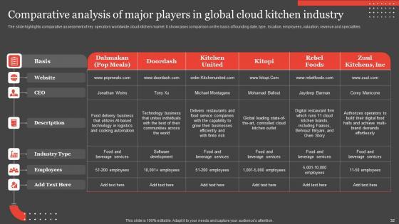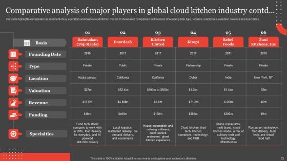 The slide highlights comparative assessment of key operators worldwide cloud kitchen market. It showcases comparison on the basis of founding date, type, location, employees, valuation, revenue and specialties. Crafting an eye-catching presentation has never been more straightforward. Let your presentation shine with this tasteful yet straightforward International Food Delivery Market Comparative Analysis Of Major Players In Global Pictures Pdf template. It offers a minimalistic and classy look that is great for making a statement. The colors have been employed intelligently to add a bit of playfulness while still remaining professional. Construct the ideal International Food Delivery Market Comparative Analysis Of Major Players In Global Pictures Pdf that effortlessly grabs the attention of your audience. Begin now and be certain to wow your customers. The slide highlights comparative assessment of key operators worldwide cloud kitchen market. It showcases comparison on the basis of founding date, type, location, employees, valuation, revenue and specialties.
