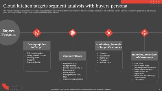 This slide covers an assessment of how cloud kitchen products and services will fit into a certain market and where they will acquire the most traction with customers. It covers elements such as demographics to target, company goals, marketing channels to target customers and consumer interests and behaviors. If you are looking for a format to display your unique thoughts, then the professionally designed International Food Delivery Market Cloud Kitchen Targets Segment Analysis With Buyers Elements Pdf is the one for you. You can use it as a Google Slides template or a PowerPoint template. Incorporate impressive visuals, symbols, images, and other charts. Modify or reorganize the text boxes as you desire. Experiment with shade schemes and font pairings. Alter, share or cooperate with other people on your work. Download International Food Delivery Market Cloud Kitchen Targets Segment Analysis With Buyers Elements Pdf and find out how to give a successful presentation. Present a perfect display to your team and make your presentation unforgettable. This slide covers an assessment of how cloud kitchen products and services will fit into a certain market and where they will acquire the most traction with customers. It covers elements such as demographics to target, company goals, marketing channels to target customers and consumer interests and behaviors.