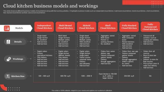 This slide shows six different business models of cloud kitchen along with their working activities. It highlights business models such as independent cloud kitchen, multi brand cloud kitchen, hybrid cloud kitchen, shell cloud kitchen, fully stacked cloud kitchen and fully outsourced cloud kitchen. Slidegeeks is here to make your presentations a breeze with International Food Delivery Market Cloud Kitchen Business Models And Workings Designs Pdf With our easy-to-use and customizable templates, you can focus on delivering your ideas rather than worrying about formatting. With a variety of designs to choose from, you are sure to find one that suits your needs. And with animations and unique photos, illustrations, and fonts, you can make your presentation pop. So whether you are giving a sales pitch or presenting to the board, make sure to check out Slidegeeks first. This slide shows six different business models of cloud kitchen along with their working activities. It highlights business models such as independent cloud kitchen, multi brand cloud kitchen, hybrid cloud kitchen, shell cloud kitchen, fully stacked cloud kitchen and fully outsourced cloud kitchen.