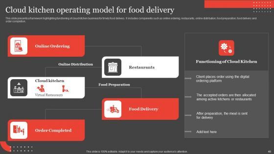 This slide presents a framework highlighting functioning of cloud kitchen business for timely food delivery. It includes components such as online ordering, restaurants, online distribution, food preparation, food delivery and order completion. Find highly impressive International Food Delivery Market Cloud Kitchen Operating Model For Food Delivery Rules Pdf on Slidegeeks to deliver a meaningful presentation. You can save an ample amount of time using these presentation templates. No need to worry to prepare everything from scratch because Slidegeeks experts have already done a huge research and work for you. You need to download International Food Delivery Market Cloud Kitchen Operating Model For Food Delivery Rules Pdf for your upcoming presentation. All the presentation templates are 100 percent editable and you can change the color and personalize the content accordingly. Download now. This slide presents a framework highlighting functioning of cloud kitchen business for timely food delivery. It includes components such as online ordering, restaurants, online distribution, food preparation, food delivery and order completion.