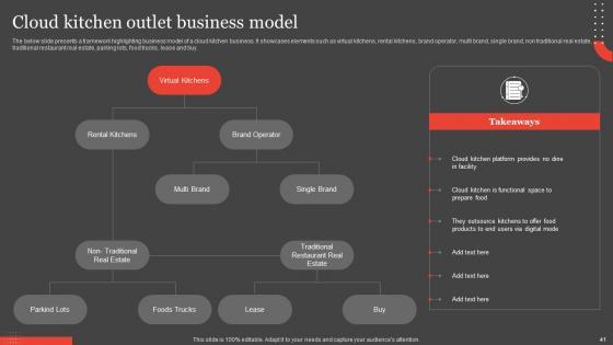 The below slide presents a framework highlighting business model of a cloud kitchen business. It showcases elements such as virtual kitchens, rental kitchens, brand operator, multi brand, single brand, non traditional real estate, traditional restaurant real estate, parking lots, food trucks, lease and buy. If your project calls for a presentation, then Slidegeeks is your go-to partner because we have professionally designed, easy-to-edit templates that are perfect for any presentation. After downloading, you can easily edit International Food Delivery Market Cloud Kitchen Outlet Business Model Designs Pdf and make the changes accordingly. You can rearrange slides or fill them with different images. Check out all the handy templates The below slide presents a framework highlighting business model of a cloud kitchen business. It showcases elements such as virtual kitchens, rental kitchens, brand operator, multi brand, single brand, non traditional real estate, traditional restaurant real estate, parking lots, food trucks, lease and buy.