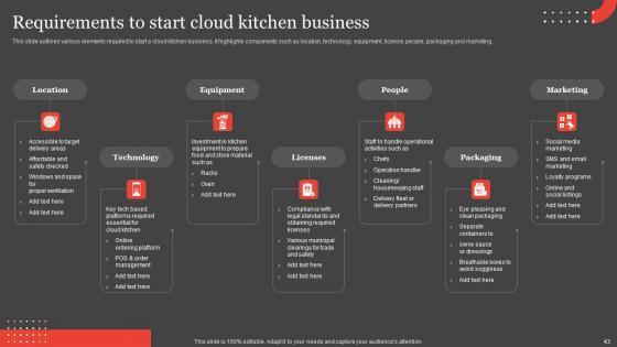 This slide outlines various elements required to start a cloud kitchen business. It highlights components such as location, technology, equipment, license, people, packaging and marketing. This International Food Delivery Market Requirements To Start Cloud Kitchen Business Formats Pdf from Slidegeeks makes it easy to present information on your topic with precision. It provides customization options, so you can make changes to the colors, design, graphics, or any other component to create a unique layout. It is also available for immediate download, so you can begin using it right away. Slidegeeks has done good research to ensure that you have everything you need to make your presentation stand out. Make a name out there for a brilliant performance. This slide outlines various elements required to start a cloud kitchen business. It highlights components such as location, technology, equipment, license, people, packaging and marketing.