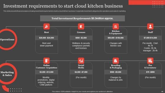 This slide presents financial analysis showing investment requirements to build a cloud kitchen business. It segments investment categories into operations and sales and marketing. Explore a selection of the finest International Food Delivery Market Investment Requirements To Start Cloud Kitchen Background Pdf here. With a plethora of professionally designed and pre-made slide templates, you can quickly and easily find the right one for your upcoming presentation. You can use our International Food Delivery Market Investment Requirements To Start Cloud Kitchen Background Pdf to effectively convey your message to a wider audience. Slidegeeks has done a lot of research before preparing these presentation templates. The content can be personalized and the slides are highly editable. Grab templates today from Slidegeeks. This slide presents financial analysis showing investment requirements to build a cloud kitchen business. It segments investment categories into operations and sales and marketing.