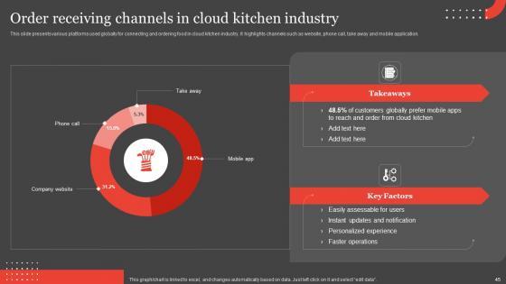 This slide presents various platforms used globally for connecting and ordering food in cloud kitchen industry. It highlights channels such as website, phone call, take away and mobile application. Retrieve professionally designed International Food Delivery Market Order Receiving Channels In Cloud Kitchen Industry Pictures Pdf to effectively convey your message and captivate your listeners. Save time by selecting pre-made slideshows that are appropriate for various topics, from business to educational purposes. These themes come in many different styles, from creative to corporate, and all of them are easily adjustable and can be edited quickly. Access them as PowerPoint templates or as Google Slides themes. You do not have to go on a hunt for the perfect presentation because Slidegeeks got you covered from everywhere. This slide presents various platforms used globally for connecting and ordering food in cloud kitchen industry. It highlights channels such as website, phone call, take away and mobile application.