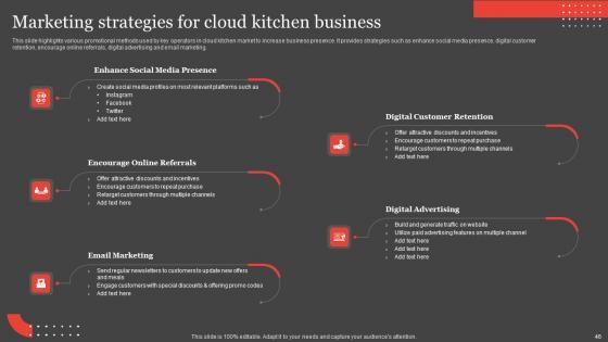 This slide highlights various promotional methods used by key operators in cloud kitchen market to increase business presence. It provides strategies such as enhance social media presence, digital customer retention, encourage online referrals, digital advertising and email marketing. Present like a pro with Marketing Strategies For Cloud Kitchen Business International Food Delivery Market Formats Pdf Create beautiful presentations together with your team, using our easy-to-use presentation slides. Share your ideas in real-time and make changes on the fly by downloading our templates. So whether you are in the office, on the go, or in a remote location, you can stay in sync with your team and present your ideas with confidence. With Slidegeeks presentation got a whole lot easier. Grab these presentations today. This slide highlights various promotional methods used by key operators in cloud kitchen market to increase business presence. It provides strategies such as enhance social media presence, digital customer retention, encourage online referrals, digital advertising and email marketing.