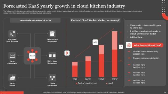 The following slide illustrates growth in of kitchen as a service model in dark kitchen market along with potential KaaS customers which are integrated dark kitchen, independent restaurants, mid sized restaurants, chain restaurants, virtual brands and virtual restaurants. This modern and well-arranged International Food Delivery Market Forecasted Kaas Yearly Growth In Cloud Kitchen Elements Pdf provides lots of creative possibilities. It is very simple to customize and edit with the Powerpoint Software. Just drag and drop your pictures into the shapes. All facets of this template can be edited with Powerpoint no extra software is necessary. Add your own material, put your images in the places assigned for them, adjust the colors, and then you can show your slides to the world, with an animated slide included. The following slide illustrates growth in of kitchen as a service model in dark kitchen market along with potential KaaS customers which are integrated dark kitchen, independent restaurants, mid sized restaurants, chain restaurants, virtual brands and virtual restaurants.