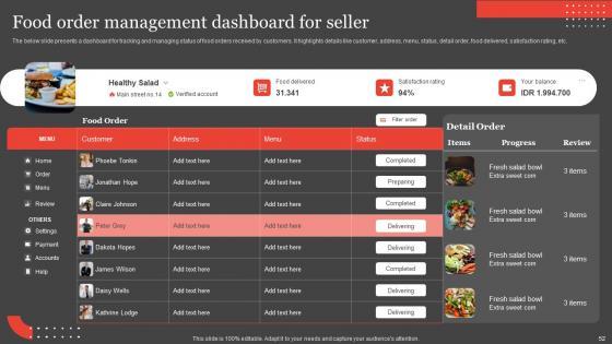 The below slide presents a dashboard for tracking and managing status of food orders received by customers. It highlights details like customer, address, menu, status, detail order, food delivered, satisfaction rating, etc. Coming up with a presentation necessitates that the majority of the effort goes into the content and the message you intend to convey. The visuals of a PowerPoint presentation can only be effective if it supplements and supports the story that is being told. Keeping this in mind our experts created International Food Delivery Market Food Order Management Dashboard For Seller Graphics Pdf to reduce the time that goes into designing the presentation. This way, you can concentrate on the message while our designers take care of providing you with the right template for the situation. The below slide presents a dashboard for tracking and managing status of food orders received by customers. It highlights details like customer, address, menu, status, detail order, food delivered, satisfaction rating, etc.