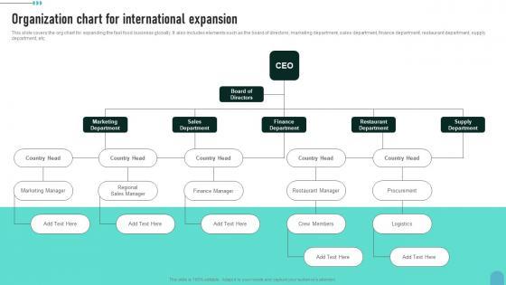 This slide covers the org chart for expanding the fast food business globally. It also includes elements such as the board of directors, marketing department, sales department, finance department, restaurant department, supply department, etc.Slidegeeks has constructed Organization Chart For International Expansion Enhancing Global Presence Infographics Pdf after conducting extensive research and examination. These presentation templates are constantly being generated and modified based on user preferences and critiques from editors. Here, you will find the most attractive templates for a range of purposes while taking into account ratings and remarks from users regarding the content. This is an excellent jumping-off point to explore our content and will give new users an insight into our top-notch PowerPoint Templates. This slide covers the org chart for expanding the fast food business globally. It also includes elements such as the board of directors, marketing department, sales department, finance department, restaurant department, supply department, etc.