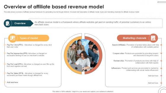 This slide shows overview of affiliate revenue framework for generating income though internet. It include brief description of affiliate model, types and marketing channels for affiliate revenue model. Create an editable Overview Of Affiliate Based Revenue Internet Based Trade Structure Ppt Slide that communicates your idea and engages your audience. Whether you are presenting a business or an educational presentation, pre-designed presentation templates help save time. Overview Of Affiliate Based Revenue Internet Based Trade Structure Ppt Slide is highly customizable and very easy to edit, covering many different styles from creative to business presentations. Slidegeeks has creative team members who have crafted amazing templates. So, go and get them without any delay. This slide shows overview of affiliate revenue framework for generating income though internet. It include brief description of affiliate model, types and marketing channels for affiliate revenue model