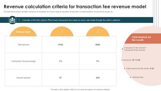 This slide shows revenue calculation mechanism for transaction fee revenue model for calculation of total profits. It include transaction amount and fee charges, etc. If you are looking for a format to display your unique thoughts, then the professionally designed Revenue Calculation Criteria For Internet Based Trade Structure Ppt Template is the one for you. You can use it as a Google Slides template or a PowerPoint template. Incorporate impressive visuals, symbols, images, and other charts. Modify or reorganize the text boxes as you desire. Experiment with shade schemes and font pairings. Alter, share or cooperate with other people on your work. Download Revenue Calculation Criteria For Internet Based Trade Structure Ppt Template and find out how to give a successful presentation. Present a perfect display to your team and make your presentation unforgettable. This slide shows revenue calculation mechanism for transaction fee revenue model for calculation of total profits. It include transaction amount and fee charges, etc.