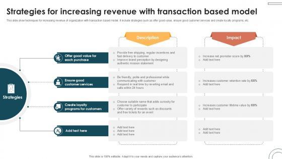 This slide show techniques for increasing revenue of organization with transaction based model. It include strategies such as offer good value, ensure good customer services and create loyalty programs, etc. Welcome to our selection of the Strategies For Increasing Revenue With Internet Based Trade Structure Ppt Slide. These are designed to help you showcase your creativity and bring your sphere to life. Planning and Innovation are essential for any business that is just starting out. This collection contains the designs that you need for your everyday presentations. All of our PowerPoints are 100Percent editable, so you can customize them to suit your needs. This multi-purpose template can be used in various situations. Grab these presentation templates today. This slide show techniques for increasing revenue of organization with transaction based model. It include strategies such as offer good value, ensure good customer services and create loyalty programs, etc.