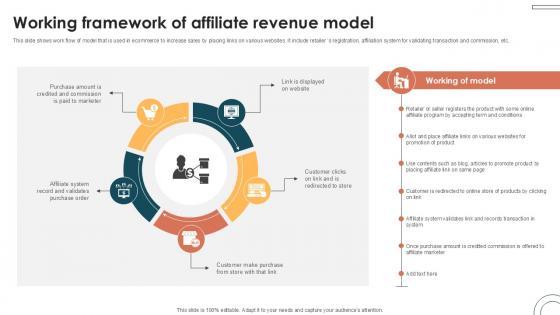 This slide shows work flow of model that is used in ecommerce to increase sales by placing links on various websites. It include retailer s registration, affiliation system for validating transaction and commission, etc. Here you can discover an assortment of the finest PowerPoint and Google Slides templates. With these templates, you can create presentations for a variety of purposes while simultaneously providing your audience with an eye-catching visual experience. Download Working Framework Of Affiliate Internet Based Trade Structure Ppt Powerpoint to deliver an impeccable presentation. These templates will make your job of preparing presentations much quicker, yet still, maintain a high level of quality. Slidegeeks has experienced researchers who prepare these templates and write high-quality content for you. Later on, you can personalize the content by editing the Working Framework Of Affiliate Internet Based Trade Structure Ppt Powerpoint. This slide shows work flow of model that is used in ecommerce to increase sales by placing links on various websites. It include retailer s registration, affiliation system for validating transaction and commission, etc.