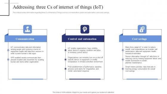 This slide provides information regarding three Cs of Internet of Things such as communication, control and automation, and costs savings. Coming up with a presentation necessitates that the majority of the effort goes into the content and the message you intend to convey. The visuals of a PowerPoint presentation can only be effective if it supplements and supports the story that is being told. Keeping this in mind our experts created Addressing Three Cs Of Internet Of Things Iot Exploring Internet Things Clipart PDF to reduce the time that goes into designing the presentation. This way, you can concentrate on the message while our designers take care of providing you with the right template for the situation. This slide provides information regarding three Cs of Internet of Things such as communication, control and automation, and costs savings.