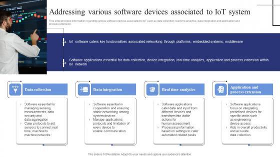 This slide provides information regarding various software devices associated to IoT such as data collection, real time analytics, data integration and application and process extension. Welcome to our selection of the Addressing Various Software Devices Associated To Exploring Internet Things Rules PDF. These are designed to help you showcase your creativity and bring your sphere to life. Planning and Innovation are essential for any business that is just starting out. This collection contains the designs that you need for your everyday presentations. All of our PowerPoints are 100 percent editable, so you can customize them to suit your needs. This multi-purpose template can be used in various situations. Grab these presentation templates today This slide provides information regarding various software devices associated to IoT such as data collection, real time analytics, data integration and application and process extension.