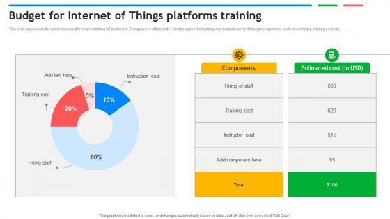 This slide showcases the breakdown cost for implementing IoT platforms . The purpose of this slide is to showcase the training cost breakdown for different components such as instructor, training cost, etc. Present like a pro with Budget For Internet Of Things Platforms Training Exploring Google Cloud IoT Platform Create beautiful presentations together with your team, using our easy to use presentation slides. Share your ideas in real time and make changes on the fly by downloading our templates. So whether you are in the office, on the go, or in a remote location, you can stay in sync with your team and present your ideas with confidence. With Slidegeeks presentation got a whole lot easier. Grab these presentations today. This slide showcases the breakdown cost for implementing IoT platforms . The purpose of this slide is to showcase the training cost breakdown for different components such as instructor, training cost, etc.