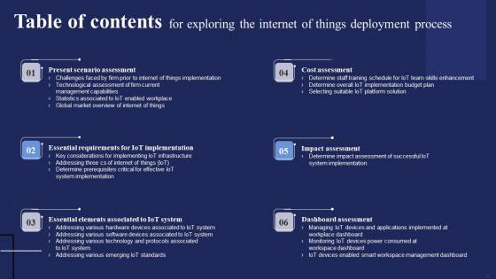 Create an editable Table Of Contents For Exploring The Internet Of Things Deployment Process Ideas PDF that communicates your idea and engages your audience. Whether you are presenting a business or an educational presentation, pre-designed presentation templates help save time. Table Of Contents For Exploring The Internet Of Things Deployment Process Ideas PDF is highly customizable and very easy to edit, covering many different styles from creative to business presentations. Slidegeeks has creative team members who have crafted amazing templates. So, go and get them without any delay. Our Table Of Contents For Exploring The Internet Of Things Deployment Process Ideas PDF are topically designed to provide an attractive backdrop to any subject. Use them to look like a presentation pro.