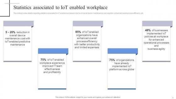 This slide provides details regarding statistics associated to IoT enabled workplace in terms of overall device maintenance cost reduction, enhanced overall process efficiency, etc. Boost your pitch with our creative Statistics Associated To Iot Enabled Workplace Exploring Internet Things Sample PDF. Deliver an awe-inspiring pitch that will mesmerize everyone. Using these presentation templates you will surely catch everyones attention. You can browse the ppts collection on our website. We have researchers who are experts at creating the right content for the templates. So you do not have to invest time in any additional work. Just grab the template now and use them. This slide provides details regarding statistics associated to IoT enabled workplace in terms of overall device maintenance cost reduction, enhanced overall process efficiency, etc.