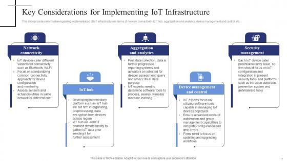 This slide provides information regarding implementation of IoT infrastructure in terms of network connectivity, IoT hub, aggregation and analytics, device management and control, etc. This Key Considerations For Implementing Iot Exploring Internet Things Background PDF from Slidegeeks makes it easy to present information on your topic with precision. It provides customization options, so you can make changes to the colors, design, graphics, or any other component to create a unique layout. It is also available for immediate download, so you can begin using it right away. Slidegeeks has done good research to ensure that you have everything you need to make your presentation stand out. Make a name out there for a brilliant performance. This slide provides information regarding implementation of IoT infrastructure in terms of network connectivity, IoT hub, aggregation and analytics, device management and control, etc.