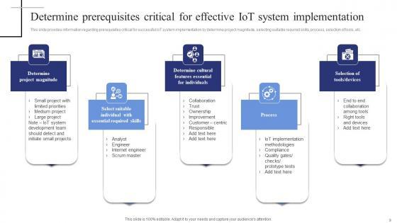 This slide provides information regarding prerequisites critical for successful IoT system implementation by determine project magnitude, selecting suitable required skills, process, selection of tools, etc. Retrieve professionally designed Determine Prerequisites Critical For Effective Iot Exploring Internet Things Rules PDF to effectively convey your message and captivate your listeners. Save time by selecting pre-made slideshows that are appropriate for various topics, from business to educational purposes. These themes come in many different styles, from creative to corporate, and all of them are easily adjustable and can be edited quickly. Access them as PowerPoint templates or as Google Slides themes. You do not have to go on a hunt for the perfect presentation because Slidegeeks got you covered from everywhere. This slide provides information regarding prerequisites critical for successful IoT system implementation by determine project magnitude, selecting suitable required skills, process, selection of tools, etc.