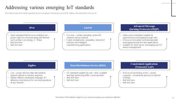 This slide provides information regarding various emerging IoT standards such as IPv6, ZigBee, data distribution services, etc. This modern and well-arranged Addressing Various Emerging Iot Standards Exploring Internet Things Download PDF provides lots of creative possibilities. It is very simple to customize and edit with the Powerpoint Software. Just drag and drop your pictures into the shapes. All facets of this template can be edited with Powerpoint, no extra software is necessary. Add your own material, put your images in the places assigned for them, adjust the colors, and then you can show your slides to the world, with an animated slide included. This slide provides information regarding various emerging IoT standards such as IPv6, ZigBee, data distribution services, etc.
