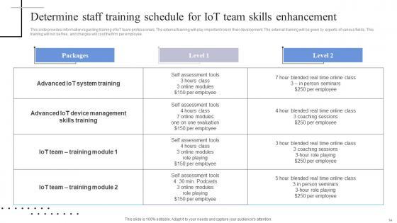 This slide provides information regarding training of IoT team professionals. The external training will play important role in their development. The external training will be given by experts of various fields. This training will not be free, and charges will cost the firm per employee. Slidegeeks has constructed Determine Staff Training Schedule For Iot Team Skills Exploring Internet Things Clipart PDF after conducting extensive research and examination. These presentation templates are constantly being generated and modified based on user preferences and critiques from editors. Here, you will find the most attractive templates for a range of purposes while taking into account ratings and remarks from users regarding the content. This is an excellent jumping-off point to explore our content and will give new users an insight into our top-notch PowerPoint Templates. This slide provides information regarding training of IoT team professionals. The external training will play important role in their development. The external training will be given by experts of various fields. This training will not be free, and charges will cost the firm per employee.