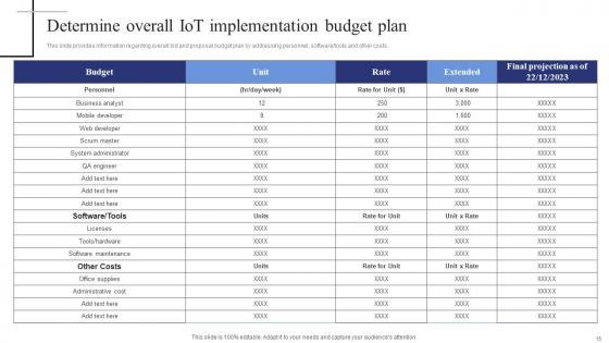 This slide provides information regarding overall bid and proposal budget plan by addressing personnel, software tools and other costs. Are you searching for a Determine Overall Iot Implementation Budget Plan Exploring Internet Things Rules PDF that is uncluttered, straightforward, and original Its easy to edit, and you can change the colors to suit your personal or business branding. For a presentation that expresses how much effort you have put in, this template is ideal With all of its features, including tables, diagrams, statistics, and lists, its perfect for a business plan presentation. Make your ideas more appealing with these professional slides. Download Determine Overall Iot Implementation Budget Plan Exploring Internet Things Rules PDF from Slidegeeks today. This slide provides information regarding overall bid and proposal budget plan by addressing personnel, software tools and other costs.