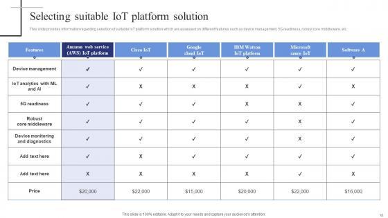 This slide provides information regarding selection of suitable IoT platform solution which are assessed on different features such as device management, 5G readiness, robust core middleware, etc. Find a pre-designed and impeccable Selecting Suitable Iot Platform Solution Exploring Internet Things Portrait PDF. The templates can ace your presentation without additional effort. You can download these easy-to-edit presentation templates to make your presentation stand out from others. So, what are you waiting for Download the template from Slidegeeks today and give a unique touch to your presentation. This slide provides information regarding selection of suitable IoT platform solution which are assessed on different features such as device management, 5G readiness, robust core middleware, etc.