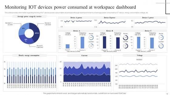 This slide provides information regarding tracking of IoT devices power consumption at workplace through dashboard in terms of average power consumed by IoT device, energy consumption, voltage, etc. Do you know about Slidesgeeks Monitoring Iot Devices Power Consumed At Exploring Internet Things Clipart PDF These are perfect for delivering any kind od presentation. Using it, create PowerPoint presentations that communicate your ideas and engage audiences. Save time and effort by using our pre-designed presentation templates that are perfect for a wide range of topic. Our vast selection of designs covers a range of styles, from creative to business, and are all highly customizable and easy to edit. Download as a PowerPoint template or use them as Google Slides themes. This slide provides information regarding tracking of IoT devices power consumption at workplace through dashboard in terms of average power consumed by IoT device, energy consumption, voltage, etc.