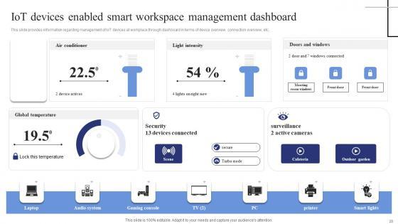 This slide provides information regarding management of IoT devices at workplace through dashboard in terms of device overview, connection overview, etc. Here you can discover an assortment of the finest PowerPoint and Google Slides templates. With these templates, you can create presentations for a variety of purposes while simultaneously providing your audience with an eye-catching visual experience. Download Iot Devices Enabled Smart Workspace Management Exploring Internet Things Ideas PDF to deliver an impeccable presentation. These templates will make your job of preparing presentations much quicker, yet still, maintain a high level of quality. Slidegeeks has experienced researchers who prepare these templates and write high-quality content for you. Later on, you can personalize the content by editing the Iot Devices Enabled Smart Workspace Management Exploring Internet Things Ideas PDF. This slide provides information regarding management of IoT devices at workplace through dashboard in terms of device overview, connection overview, etc.