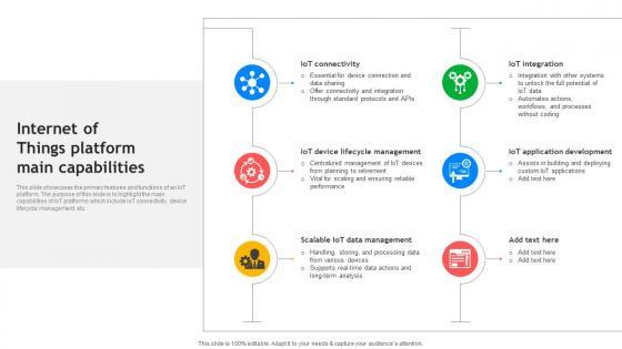 This slide showcases the primary features and functions of an IoT platform. The purpose of this slide is to highlight the main capabilities of IoT platforms which include IoT connectivity, device lifecycle management, etc. This Internet Of Things Platform Main Capabilities Exploring Google Cloud IoT Platform is perfect for any presentation, be it in front of clients or colleagues. It is a versatile and stylish solution for organizing your meetings. The Internet Of Things Platform Main Capabilities Exploring Google Cloud IoT Platform features a modern design for your presentation meetings. The adjustable and customizable slides provide unlimited possibilities for acing up your presentation. Slidegeeks has done all the homework before launching the product for you. So, do not wait, grab the presentation templates today This slide showcases the primary features and functions of an IoT platform. The purpose of this slide is to highlight the main capabilities of IoT platforms which include IoT connectivity, device lifecycle management, etc.