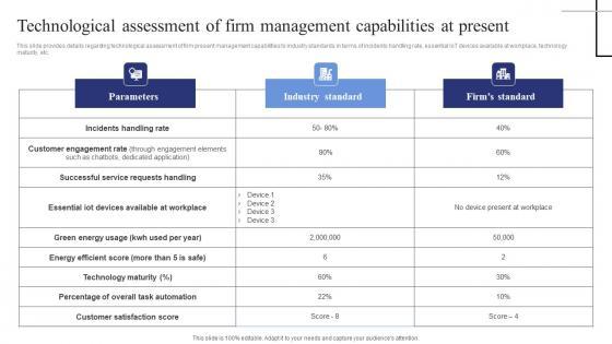 This slide provides details regarding technological assessment of firm present management capabilities to industry standards in terms of incidents handling rate, essential IoT devices available at workplace, technology maturity, etc. Slidegeeks is one of the best resources for PowerPoint templates. You can download easily and regulate Technological Assessment Of Firm Management Exploring Internet Things Summary PDF for your personal presentations from our wonderful collection. A few clicks is all it takes to discover and get the most relevant and appropriate templates. Use our Templates to add a unique zing and appeal to your presentation and meetings. All the slides are easy to edit and you can use them even for advertisement purposes. This slide provides details regarding technological assessment of firm present management capabilities to industry standards in terms of incidents handling rate, essential IoT devices available at workplace, technology maturity, etc.