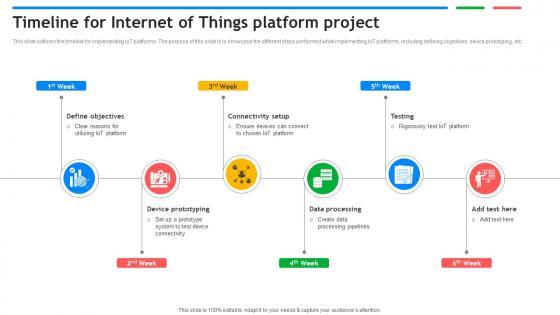 This slide outlines the timeline for implementing IoT platforms. The purpose of this slide is to showcase the different steps performed while implementing IoT platforms, including defining objectives, device prototyping, etc. Slidegeeks is here to make your presentations a breeze with Timeline For Internet Of Things Platform Project Exploring Google Cloud IoT Platform With our easy to use and customizable templates, you can focus on delivering your ideas rather than worrying about formatting. With a variety of designs to choose from, you are sure to find one that suits your needs. And with animations and unique photos, illustrations, and fonts, you can make your presentation pop. So whether you are giving a sales pitch or presenting to the board, make sure to check out Slidegeeks first This slide outlines the timeline for implementing IoT platforms. The purpose of this slide is to showcase the different steps performed while implementing IoT platforms, including defining objectives, device prototyping, etc.