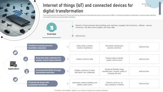 This slide examines the Internet of Things technology and how it help optimize various processes in SMEs. It includes predictive maintenance, real-time data collection, connected machines and automated workflows. Want to ace your presentation in front of a live audience Our Internet Of Things IOT And Connected Devices For Digital Transformation DT SS V can help you do that by engaging all the users towards you. Slidegeeks experts have put their efforts and expertise into creating these impeccable powerpoint presentations so that you can communicate your ideas clearly. Moreover, all the templates are customizable, and easy-to-edit and downloadable. Use these for both personal and commercial use. This slide examines the Internet of Things technology and how it help optimize various processes in SMEs. It includes predictive maintenance, real-time data collection, connected machines and automated workflows.