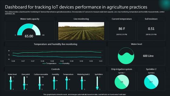 This slide provides a dashboard for monitoring IoT devices that enhance agricultural practices. It incorporates IoT sensors to measure water tank capacity, Live crop monitoring, temperature and humidity measurements, control sprinklers, etc. Make sure to capture your audiences attention in your business displays with our gratis customizable Unlocking Potential IoTs Application Dashboard For Tracking IoT Devices Performance IoT SS V. These are great for business strategies, office conferences, capital raising or task suggestions. If you desire to acquire more customers for your tech business and ensure they stay satisfied, create your own sales presentation with these plain slides. This slide provides a dashboard for monitoring IoT devices that enhance agricultural practices. It incorporates IoT sensors to measure water tank capacity, Live crop monitoring, temperature and humidity measurements, control sprinklers, etc.