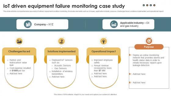 This slide exhibits a comprehensive case study of refinery equipment condition monitoring. It includes elements such as company, application industry, purpose, challenges faced, solutions implemented, and operational impact. This IoT Solutions For Oil IoT Driven Equipment Failure Monitoring Case Study IoT SS V is perfect for any presentation, be it in front of clients or colleagues. It is a versatile and stylish solution for organizing your meetings. The IoT Solutions For Oil IoT Driven Equipment Failure Monitoring Case Study IoT SS V features a modern design for your presentation meetings. The adjustable and customizable slides provide unlimited possibilities for acing up your presentation. Slidegeeks has done all the homework before launching the product for you. So, do not wait, grab the presentation templates today This slide exhibits a comprehensive case study of refinery equipment condition monitoring. It includes elements such as company, application industry, purpose, challenges faced, solutions implemented, and operational impact.