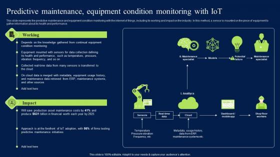 This slide represents the predictive maintenance and equipment condition monitoring with the internet of things, including its working and impact on the industry. In this method, a sensor is mounted on the piece of equipment to gather information about its health and performance. Retrieve professionally designed Smart Manufacturing With Iot Predictive Maintenance Equipment Condition Monitoring With Iot Designs PDF to effectively convey your message and captivate your listeners. Save time by selecting pre-made slideshows that are appropriate for various topics, from business to educational purposes. These themes come in many different styles, from creative to corporate, and all of them are easily adjustable and can be edited quickly. Access them as PowerPoint templates or as Google Slides themes. You do not have to go on a hunt for the perfect presentation because Slidegeeks got you covered from everywhere.