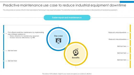 This slide provides an overview of the firm that implemented IoT technology to keep equipment updated. The slide further includes benefits that is reduction in critical downtime of manufacturing equipments. The best PPT templates are a great way to save time, energy, and resources. Slidegeeks have 100 percent editable powerpoint slides making them incredibly versatile. With these quality presentation templates, you can create a captivating and memorable presentation by combining visually appealing slides and effectively communicating your message. Download Predictive Maintenance Use Case To Reduce Industrial Equipment Optimizing Inventory Management IoT SS V from Slidegeeks and deliver a wonderful presentation. This slide provides an overview of the firm that implemented IoT technology to keep equipment updated. The slide further includes benefits that is reduction in critical downtime of manufacturing equipments.