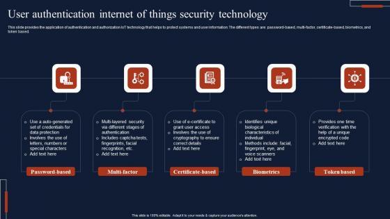 This slide provides the application of authentication and authorization IoT technology that helps to protect systems and user information. The different types are password based, multi-factor, certificate-based, biometrics, and token based. Pitch your topic with ease and precision using this User Authentication Internet Of Things Security Technology Microsoft Pdf This layout presents information on Password Based, Multi Factor, Certificate Based It is also available for immediate download and adjustment. So, changes can be made in the color, design, graphics or any other component to create a unique layout. This slide provides the application of authentication and authorization IoT technology that helps to protect systems and user information. The different types are password based, multi-factor, certificate-based, biometrics, and token based.
