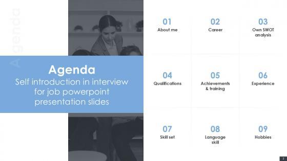Create an editable Agenda Self Introduction In Interview For Job PowerPoint Presentation Slides PPT Sample SS that communicates your idea and engages your audience. Whether you are presenting a business or an educational presentation, pre-designed presentation templates help save time. Agenda Self Introduction In Interview For Job PowerPoint Presentation Slides PPT Sample SS is highly customizable and very easy to edit, covering many different styles from creative to business presentations. Slidegeeks has creative team members who have crafted amazing templates. So, go and get them without any delay. Our Agenda Self Introduction In Interview For Job PowerPoint Presentation Slides PPT Sample SS are topically designed to provide an attractive backdrop to any subject. Use them to look like a presentation pro.