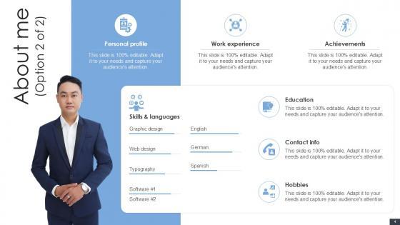 This About Me, Career Journey, Professional Qualifications, Job Interview, Self Presentation, Introduce Yourself-slide Self Introduction In Interview For Job Powerpoint Presentation Slides is your content ready tool to impress the stakeholders with your business planning and its manner of execution. Showcase your ideas and how you plan to make them real in detail with this PPT Template Bundle. The slides have the conceptual bandwidth to present the crucial aspects of your plan, such as funding, marketing, resource allocation, timeline, roadmap, and more. When you present your plans with this PPT Layout, the stakeholders are sure to come on board because you will be able to present a succinct, thought-out, winning project. Download this Complete Deck now to take control into your hands. The 100 percent customizable offer is just too good to be resisted. Our Self Introduction In Interview For Job Powerpoint Presentation Slides are topically designed to provide an attractive backdrop to any subject. Use them to look like a presentation pro.
