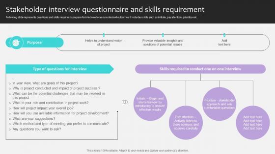 Following slide represents questions and skills requires to prepare for interview to assure desired outcomes. It includes skills such as initiate, pay attention, prioritize etc. This Project Stakeholders Management Stakeholder Interview Questionnaire And Skills Ppt Sample from Slidegeeks makes it easy to present information on your topic with precision. It provides customization options, so you can make changes to the colors, design, graphics, or any other component to create a unique layout. It is also available for immediate download, so you can begin using it right away. Slidegeeks has done good research to ensure that you have everything you need to make your presentation stand out. Make a name out there for a brilliant performance. Following slide represents questions and skills requires to prepare for interview to assure desired outcomes. It includes skills such as initiate, pay attention, prioritize etc.